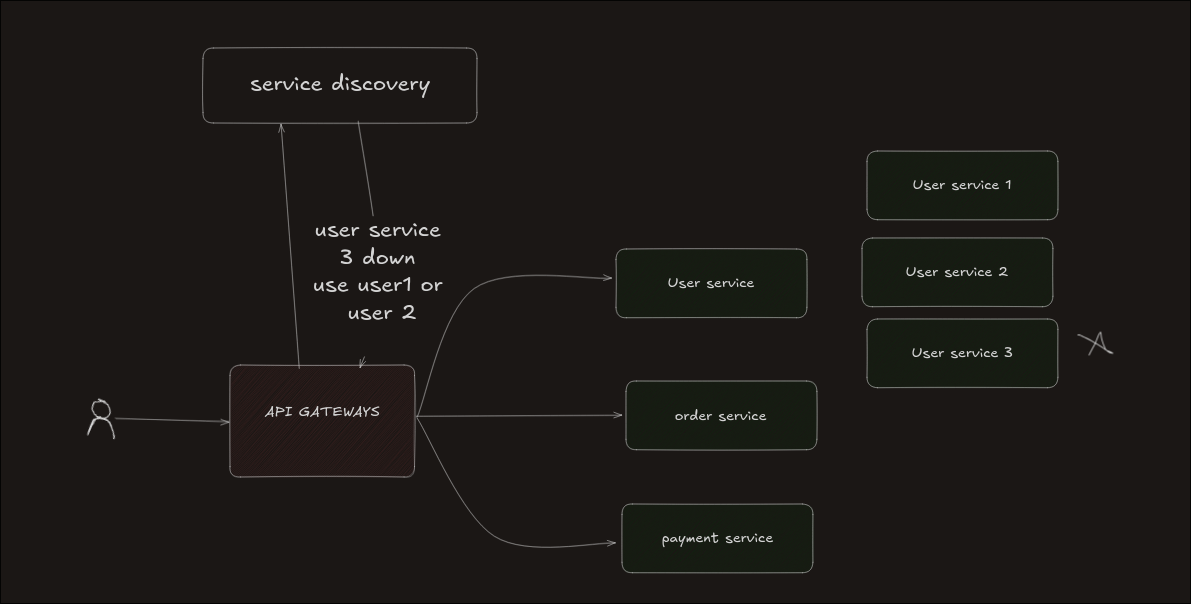 Client Request → API Gateway API Gateway → asks Service Discovery Service Discovery → returns service location API Gateway → sends request to the correct service